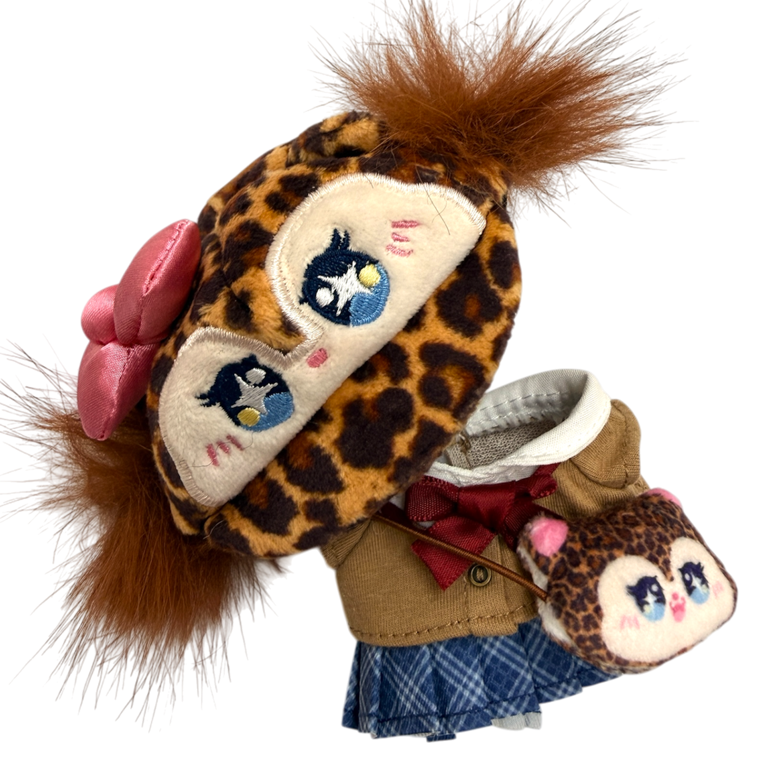 放課後の渋谷を歩く、制服ギャルをイメージした一着。ヒョウ柄キャップとピンクリボンをアクセントに、小さなぬいにぴったりの王道ギャルスタイルを再現しました。