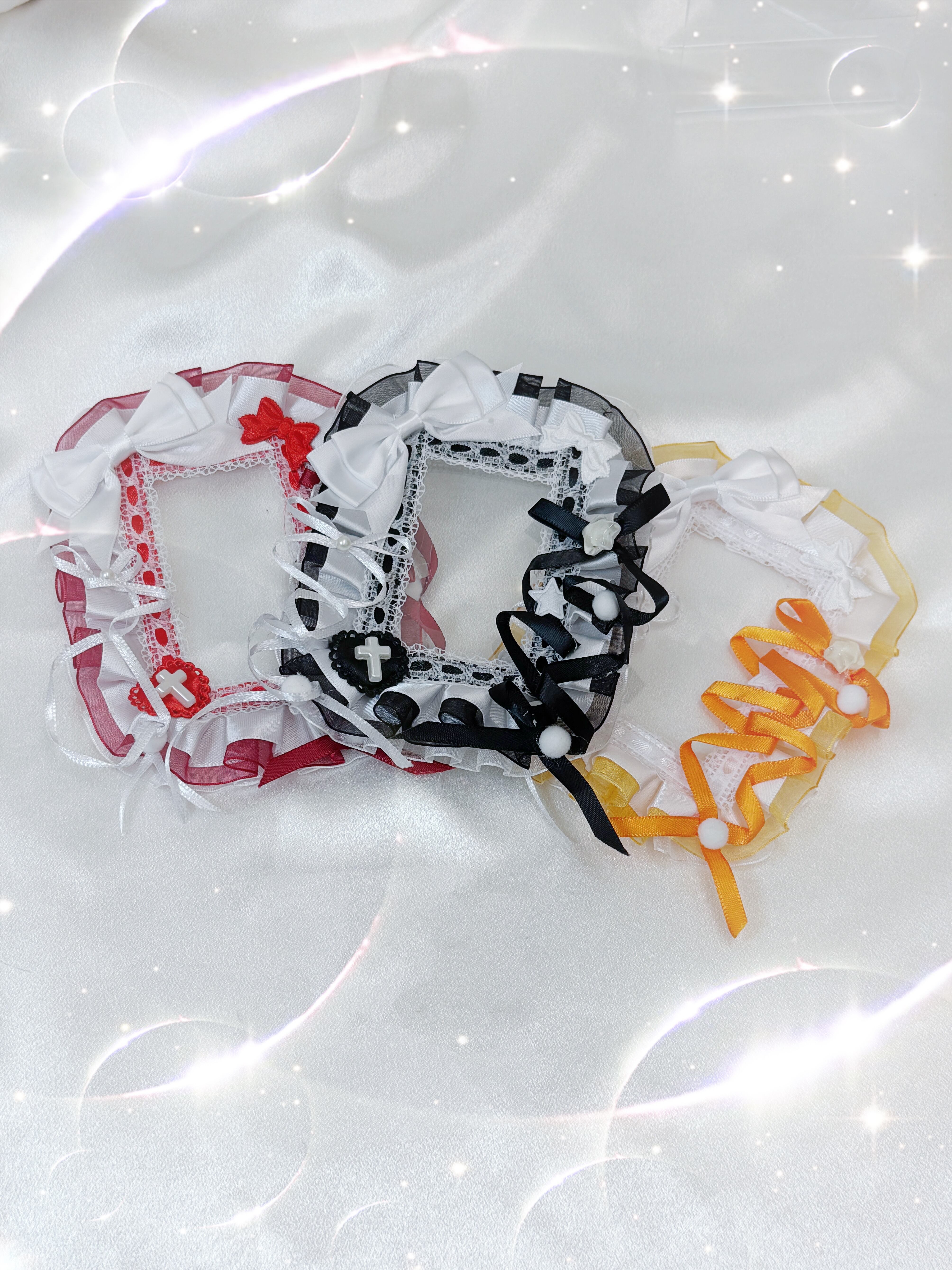 レースとリボン、クロスモチーフを組み合わせた、可愛らしさとゴシック感を兼ね備えたハンドメイドスリーブです。