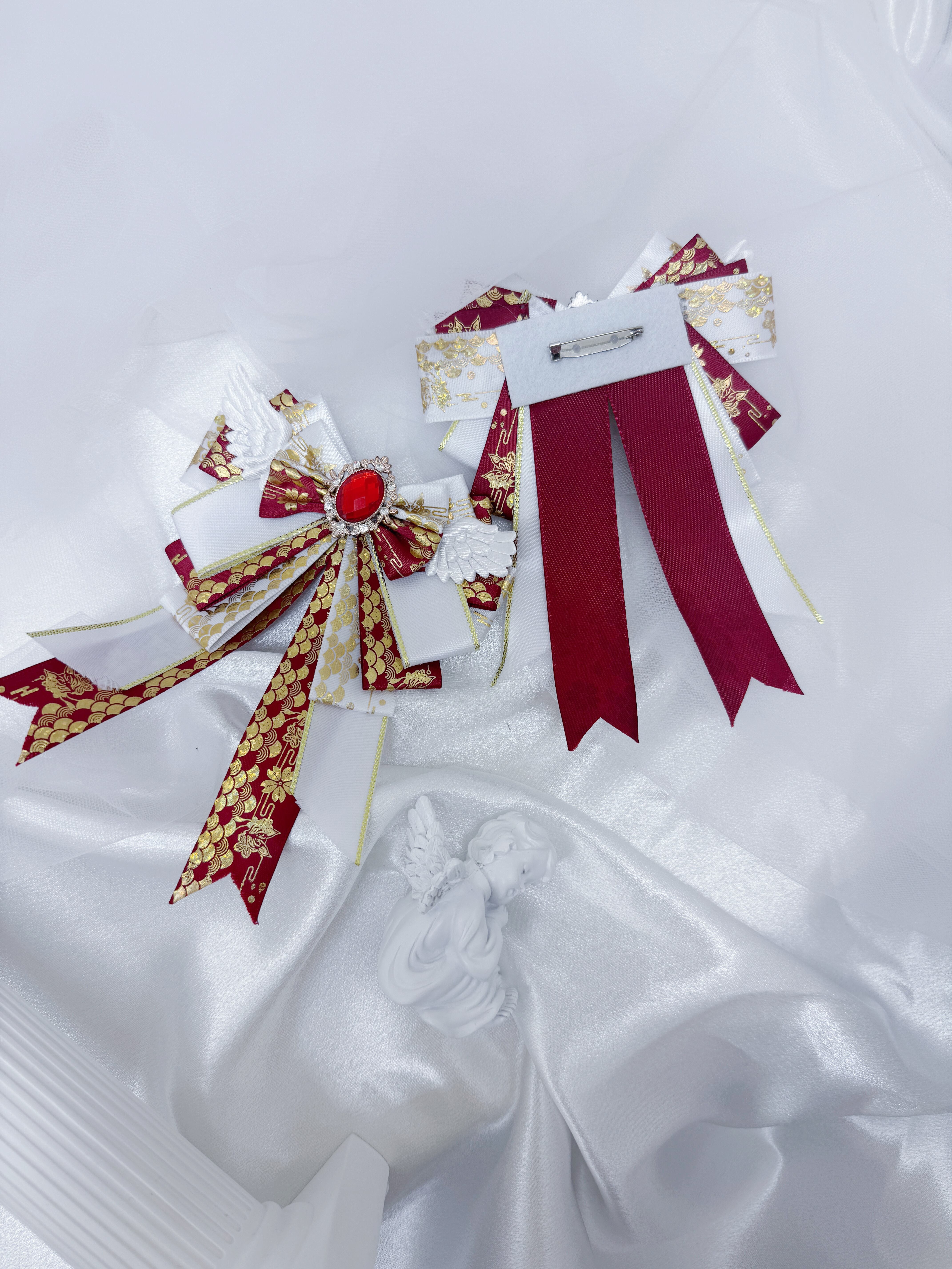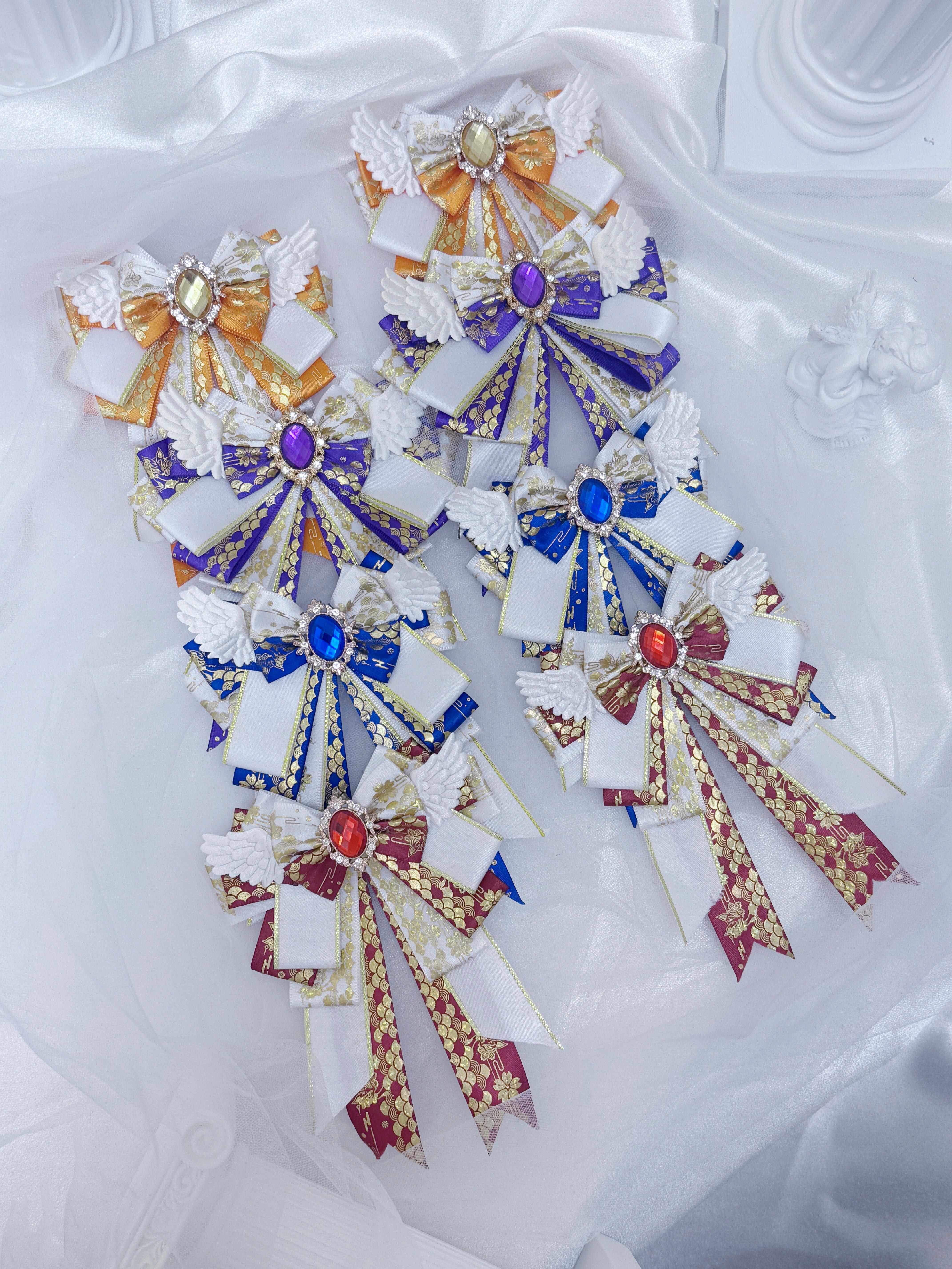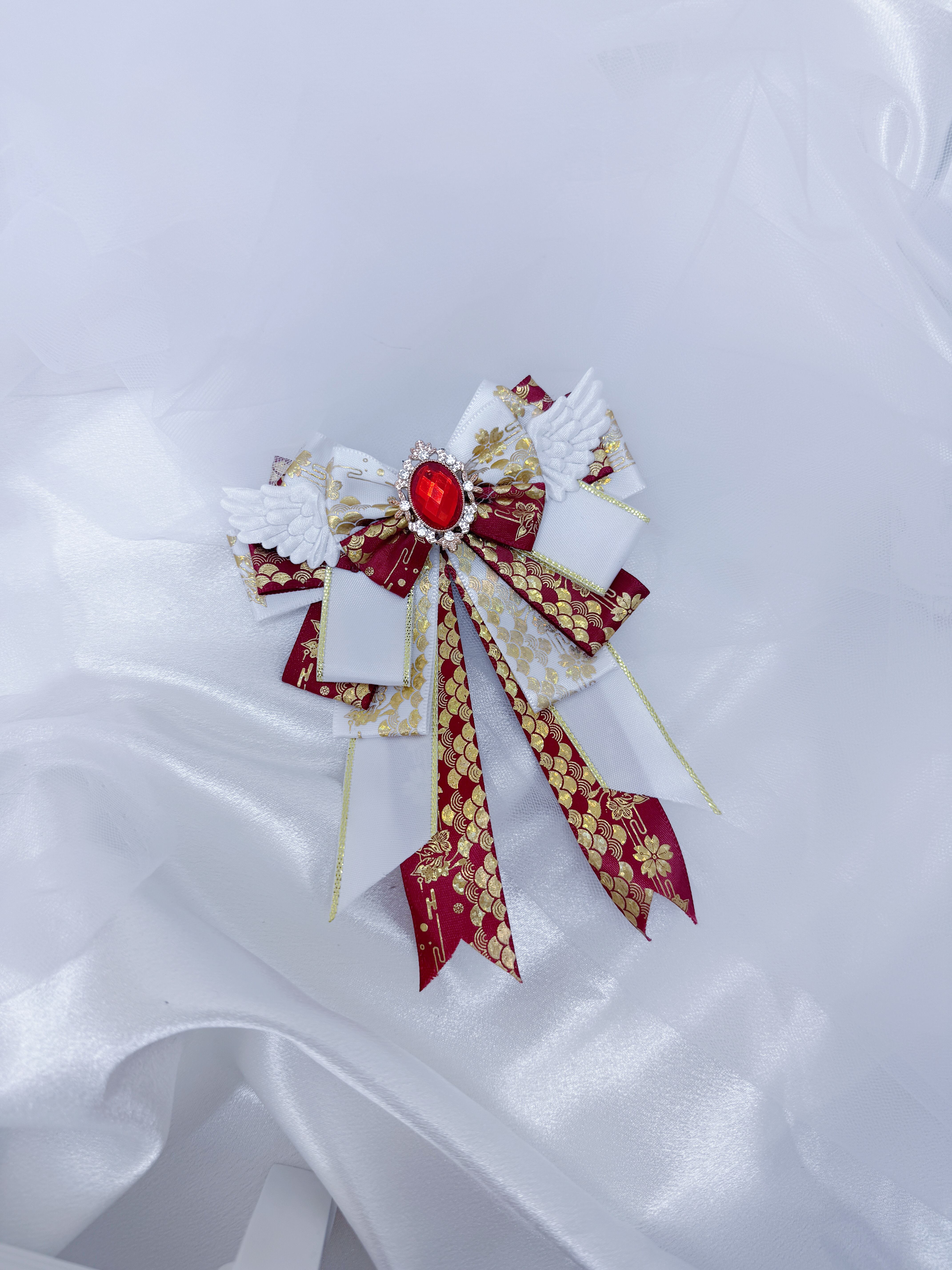 繊細なゴールド模様のリボンにきらめくビジューを添え、守護をイメージした羽をあしらった華やかなデザイン。