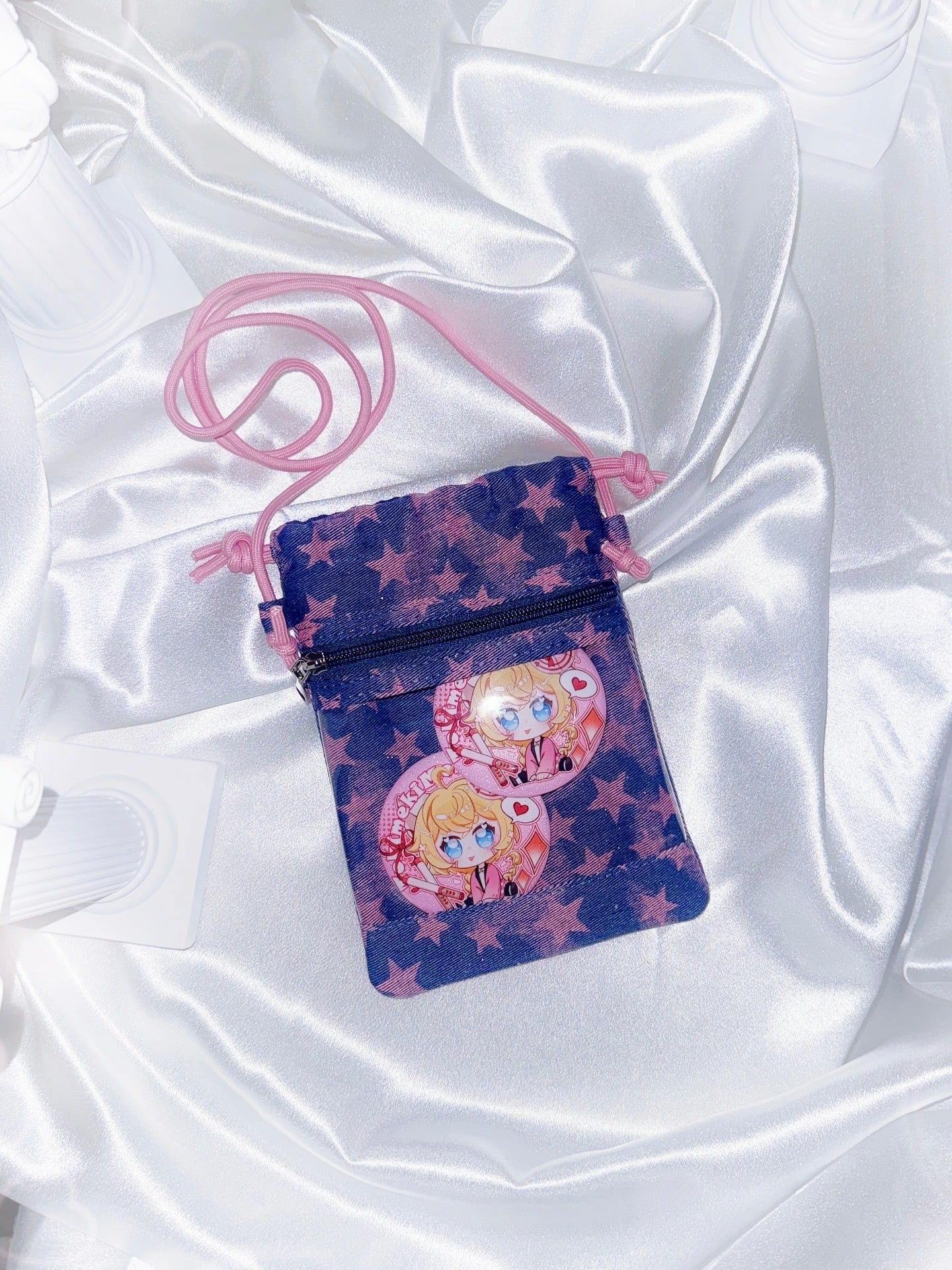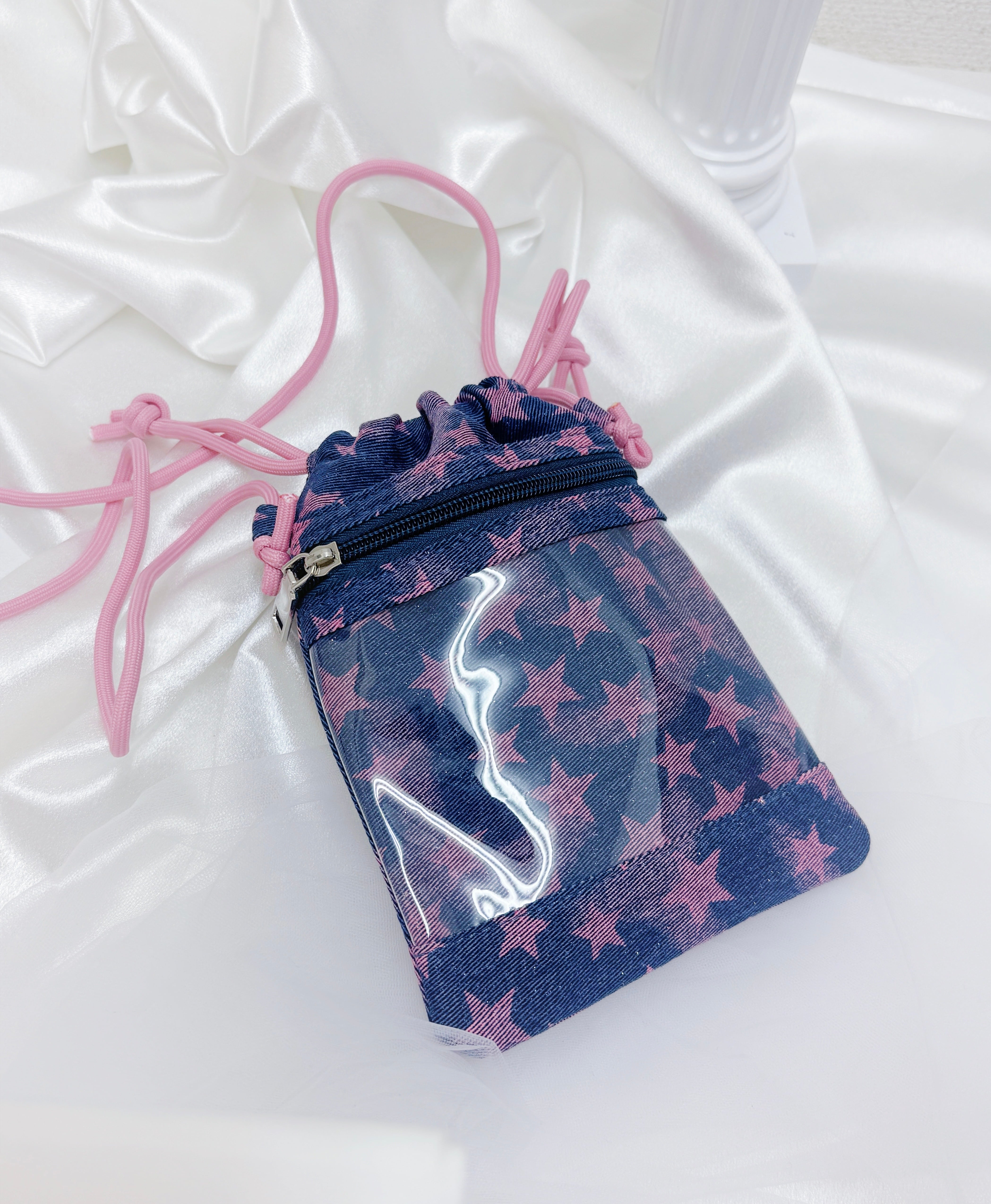 ピンクのショルダーストラップが可愛い、星柄デニムのミニ痛バです。