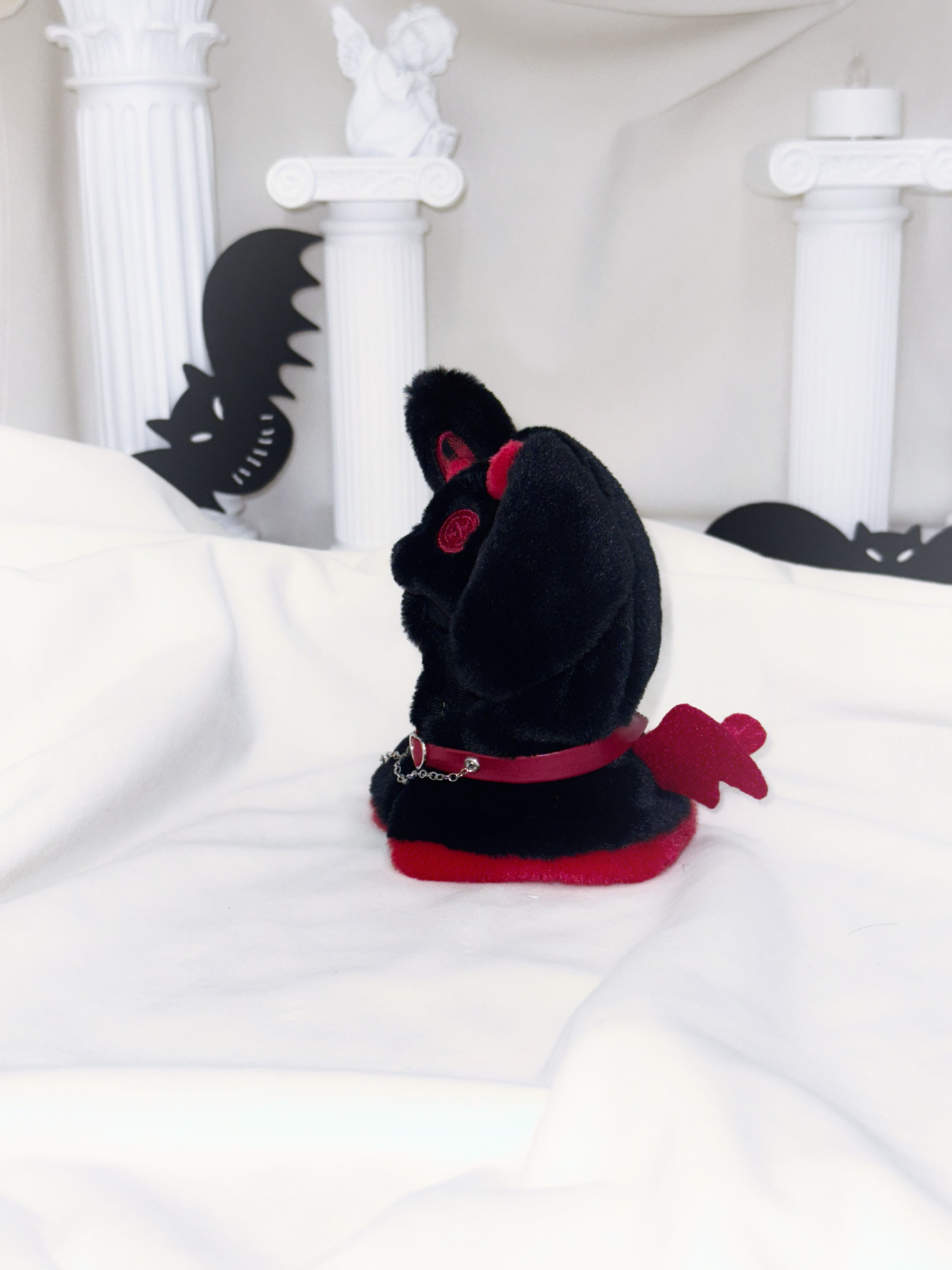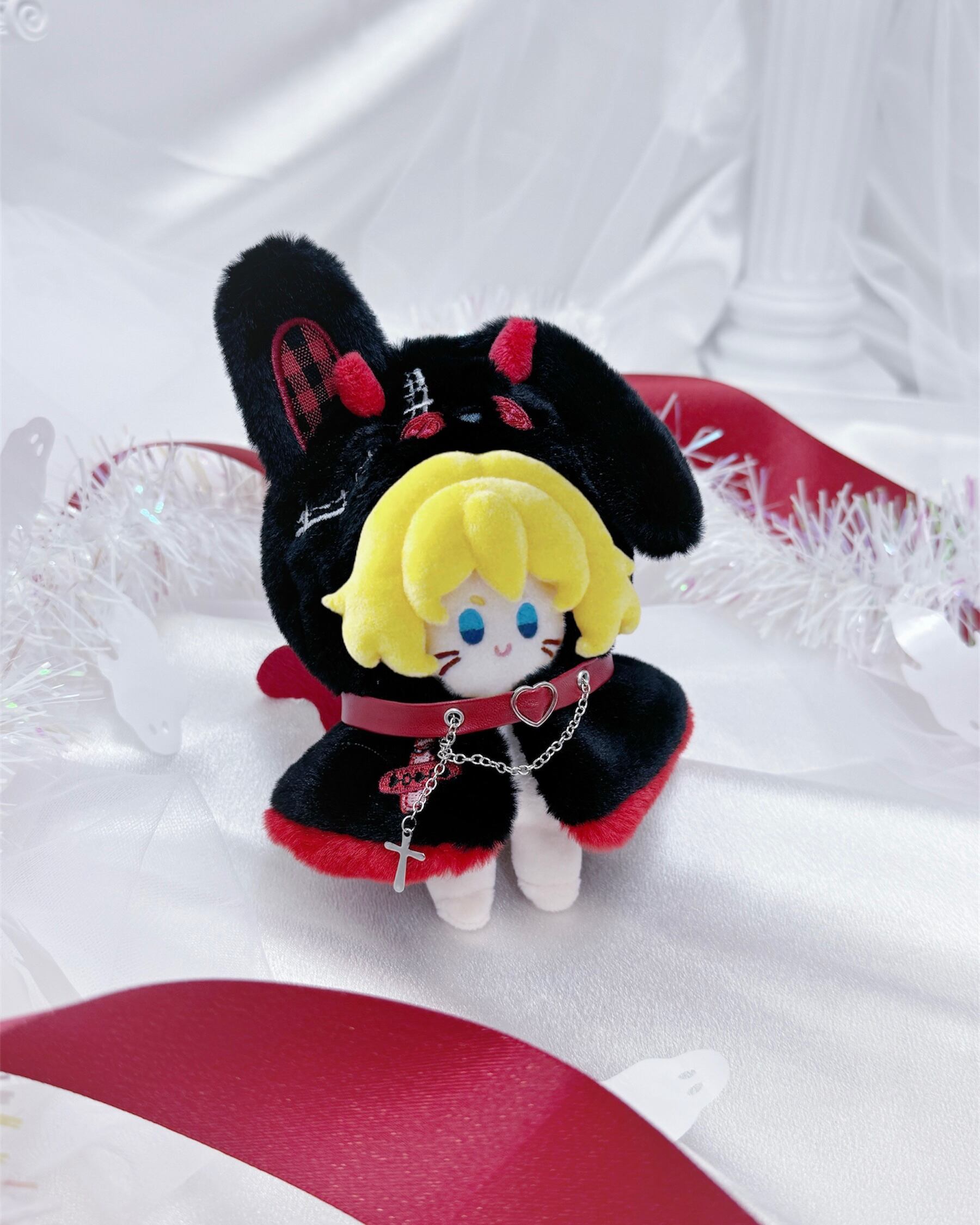 うさ耳フードには小さな悪魔角をデザイン。さらに首もとには、十字架とハートチャームを組み合わせたチェーンチョーカー付き。ダークな雰囲気の中に、可愛らしいきらめきを添えました。