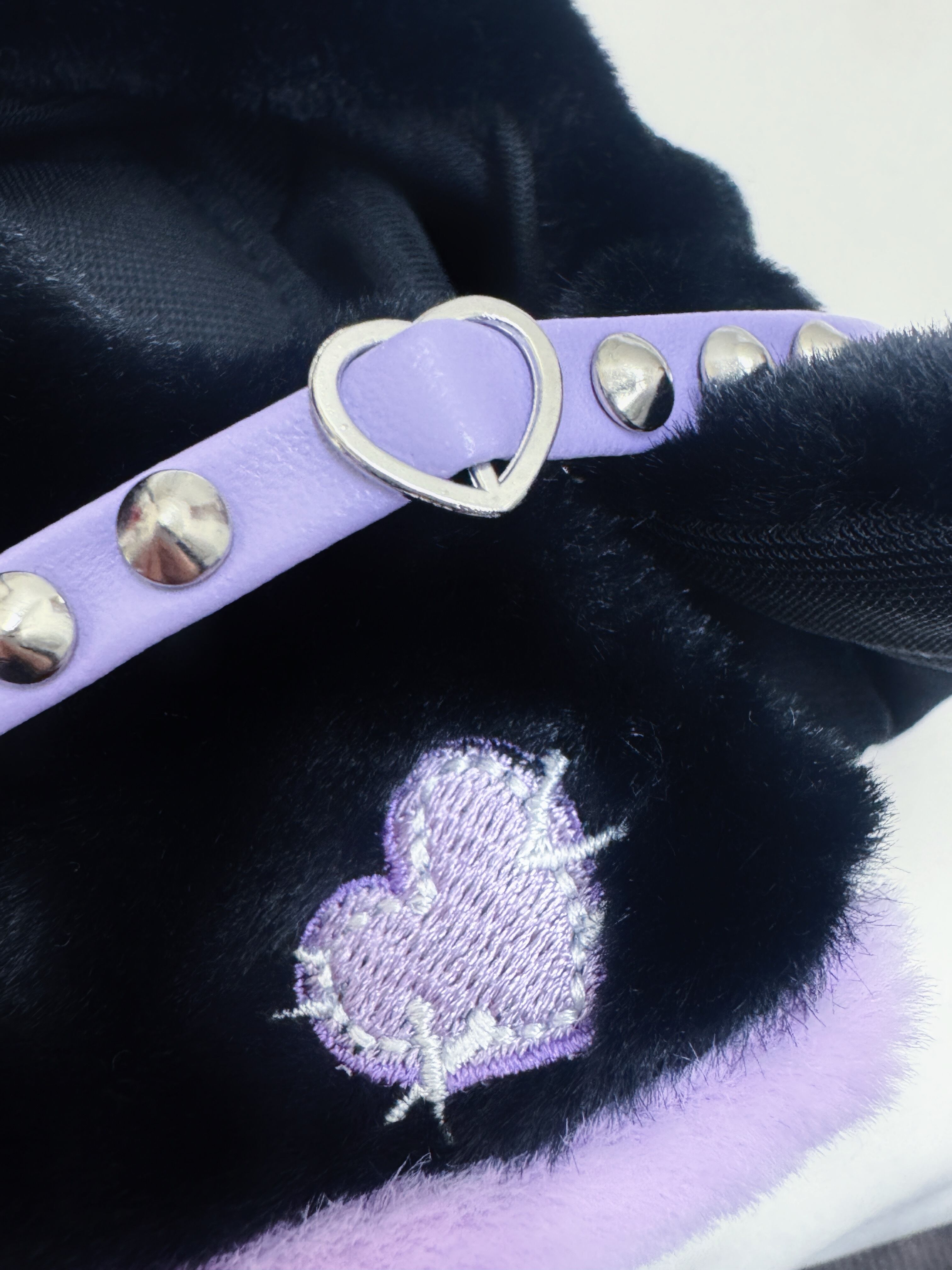 ねこ耳フードには魔女のとんがり帽子をプラス。首もとには、ハートモチーフの鋲付きチョーカーと銀色のリベットが輝きます。さらに、ハート型の傷跡刺繍がほどこされ、ダークロマンな世界観を細部まで再現しました。