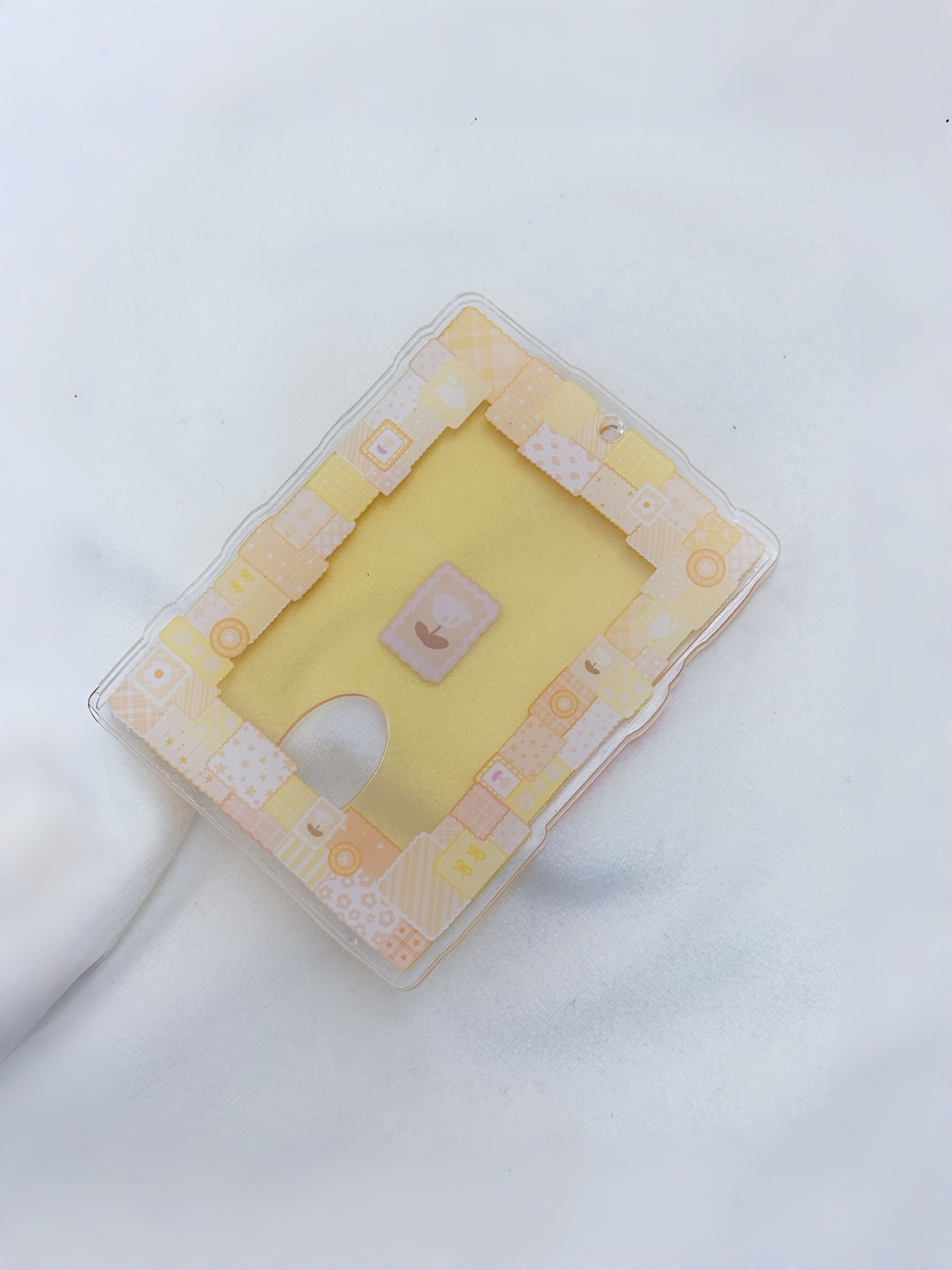 アクリルならではの光沢と透明感が、コラージュ柄をいっそう引き立て、推しカードを可愛く包み込みます。