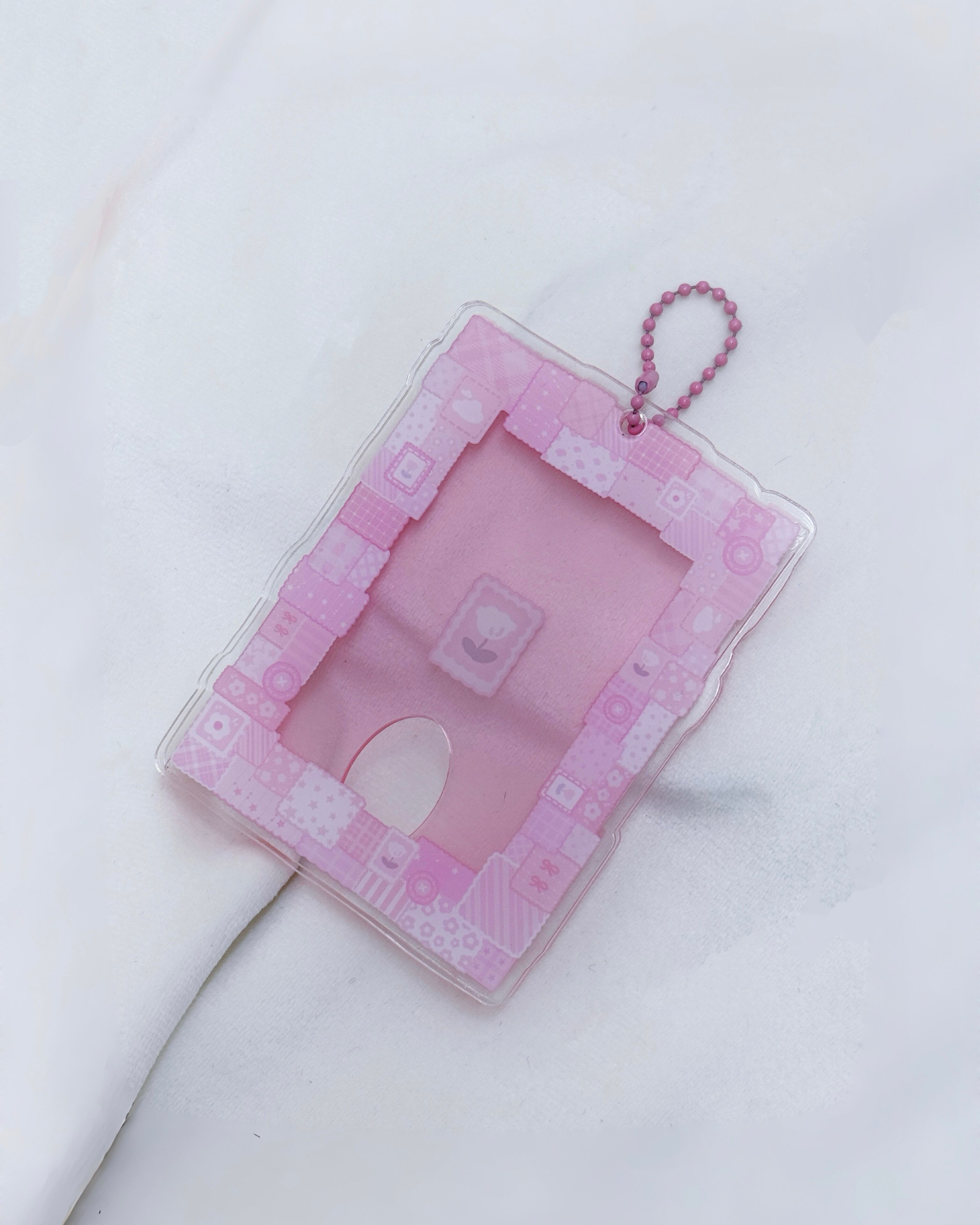 アクリルならではの光沢と透明感が、コラージュ柄をいっそう引き立て、推しカードを可愛く包み込みます。